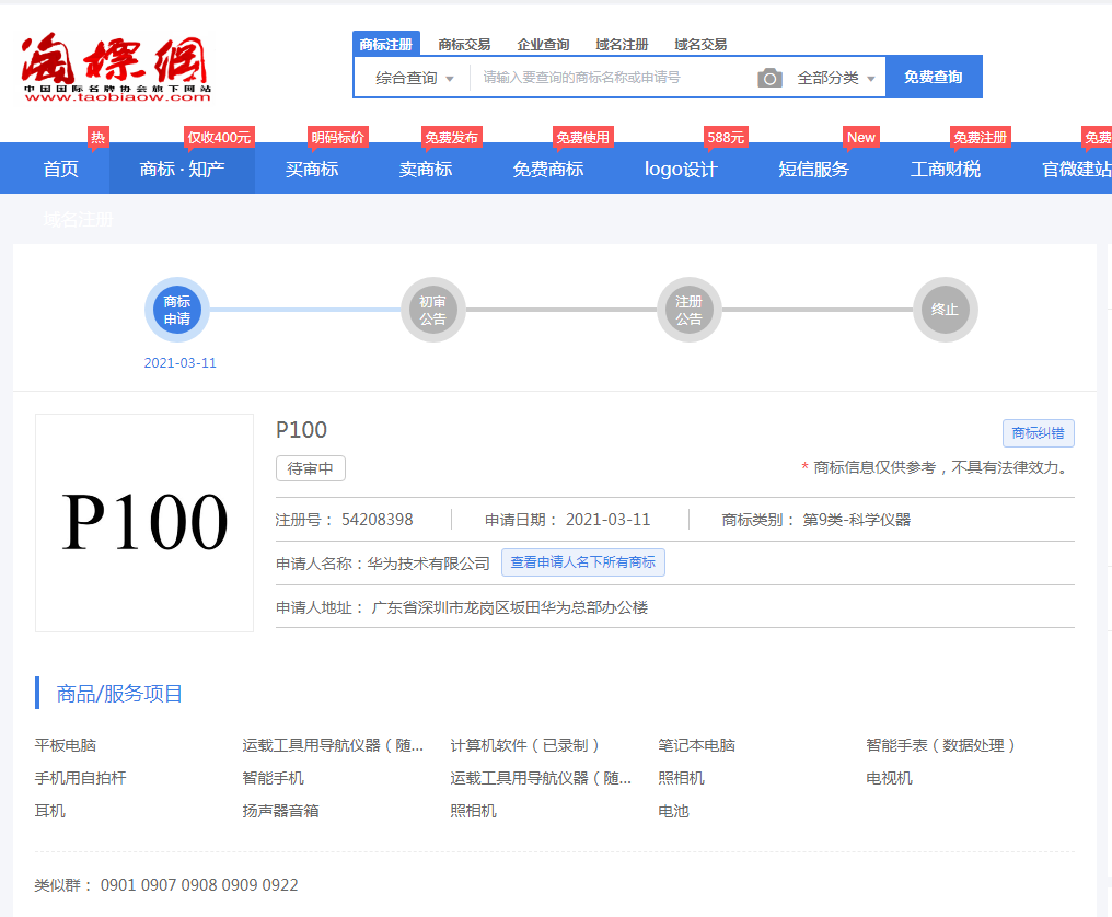 不过华为3月份申请的P100商标不止这一个分类,还有12类运输工具,目前是注册申请中。