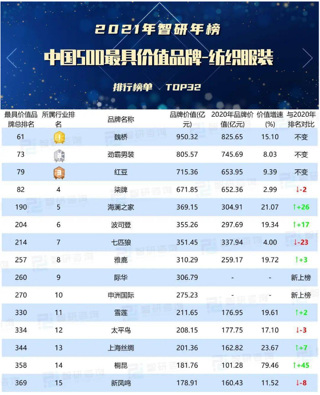 2)魏桥、劲霸男装、红豆、柒牌作为纺织服装前4的品牌,跻身进2021年中国500最具价值品牌总榜单前100,其中2个品牌均为男装品牌;