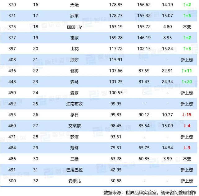 3)就与2020年品牌价值排名对比来看,纺织服装行业有7个品牌的排名出现下滑,12个品牌排名有所提升,5个品牌排名未发生变化。