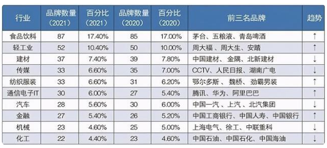 从行业分布看,今年有26个行业的品牌入选。与去年相比,汽车、旅游服务等行业受疫情影响较大,入榜品牌数量有较明显下降,食品饮料、金融、农业等“刚需”行业入榜品牌则有不同程度增加。其中,食品饮料业以87个品牌入选继续位列第一;入选数量位居第二到第五的行业分别是轻工(52个)、建材(37个)、传媒(33个)和纺织服装(33个)。