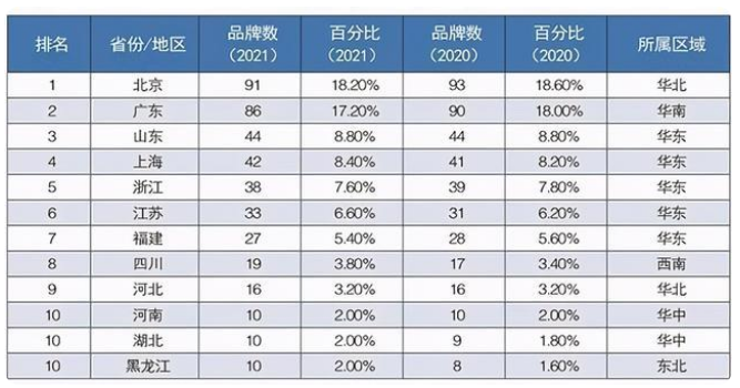 从区域分布看,北京以91个品牌位列第一,广东以86个排在第二,山东共有44个品牌入选,位列全国第三和华东地区首位。