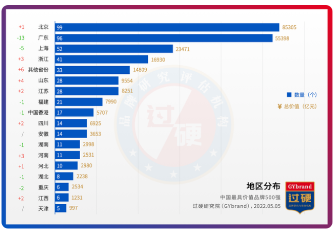 (2)广东入选品牌96个,较去年减少13个,数量首次被北京超过,其中有22个品牌进入TOP100;总价值55398亿元,依然位居第二,但已被北京拉开差距。