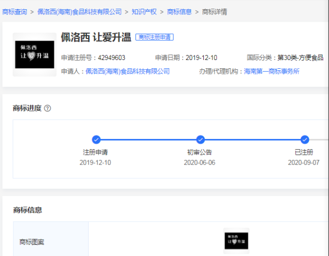 申请/注册号为42949603,国际分类30类的“佩洛西 让爱升温”商标申请人为佩洛西(海南)食品科技有限公司,申请人地址为海南省海口市琼山区云龙镇海榆北路168号云龙产业园横五路7号,代理/办理机构为海南第一商标事务所,商标状态显示:注册,专用权期限均为2020年09月07日至2030年09月06日。