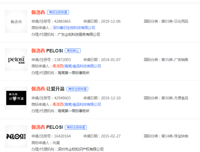 除此之外,另外还有多家公司注册“佩洛西”商标成功并已拿到商标证书。