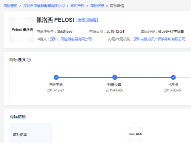而作为阿里巴巴科技(北京)有限公司为申请人成功办理“佩洛西”商标并拿到商标注册证书同样令人无语。