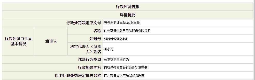 因擅自使用他人有影响力的同类产品的企业字号“阿道夫”, 有不正当竞争违法行为,7月18日,广州蓝博生活日用品股份有限公司被广州市市场监管部门罚款12万元。