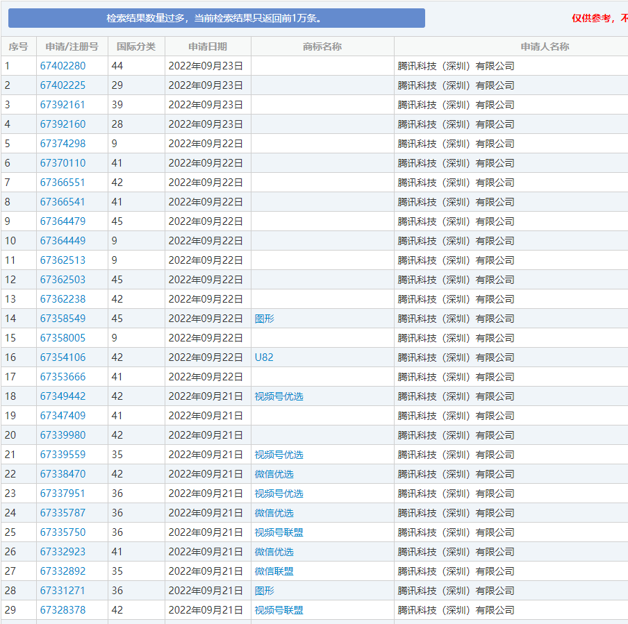 新浪科技讯 9月26日上午消息,企查查App显示,近日,腾讯科技(深圳)有限公司新增多个商标申请注册信息,包括“微信优选”“微信联盟”“视频号联盟”等,国际分类涉及广告销售、教育娱乐、金融物管等,目前商标状态均为“注册申请中”。