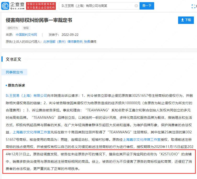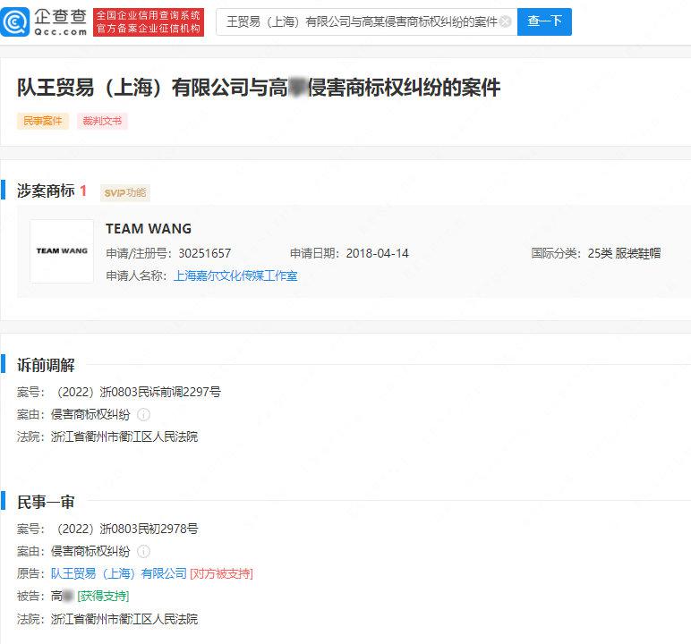 据企查查APP显示,近日,歌手王嘉尔联合创立的潮牌“TEAMWANG”关联公司,即队王贸易(上海)有限公司与高某侵害商标权纠纷民事一审裁定书公开。