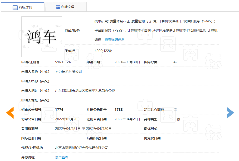 查询发现,华为技术有限公司申请注册的“鸿车”商标注册公告。