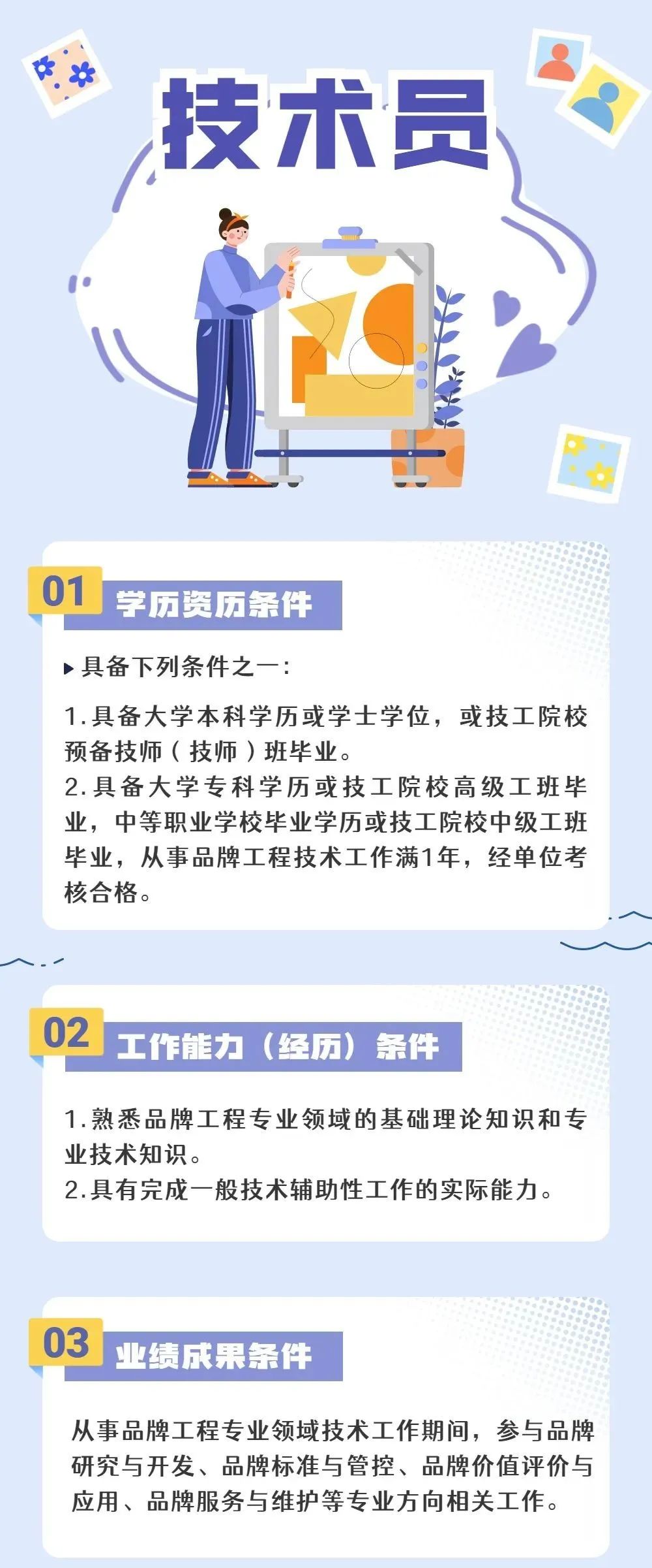同时根据品牌工作岗位特性和人才队伍构成情况,将品牌职称设置了:品牌研究与开发、品牌标准与管控、品牌价值评价与应用、品牌服务与维护四个专业方向。设置初级、中级、高级三个职称层级,其中初级分设员级和助理级,高级分设副高级和正高级。