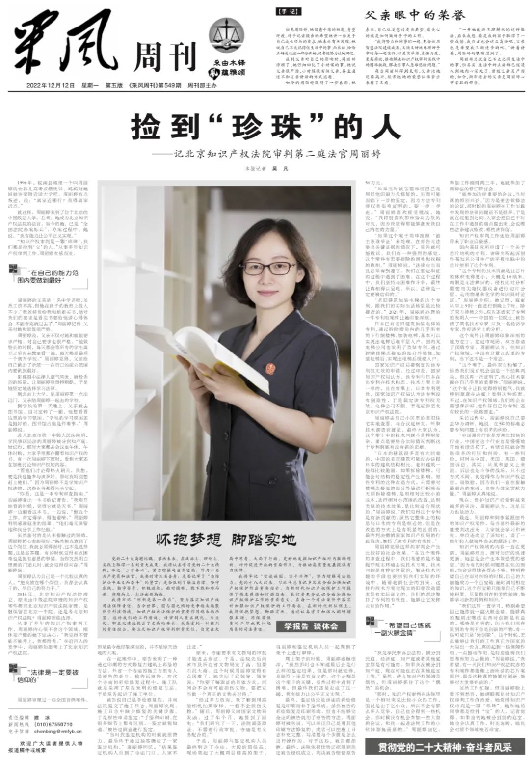 “知识产权审判是一颗‘珍珠’,我们都是捡到‘宝’的人。”从事多年知识产权审判工作,周丽婷有感而发。