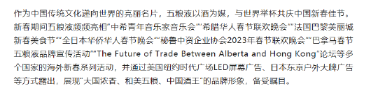 新闻稿中提到,五粮液以酒为媒,与世界举杯共庆中国新春佳节,展现“大国浓香、和美五粮、中国酒王”的品牌形象,备受瞩目。