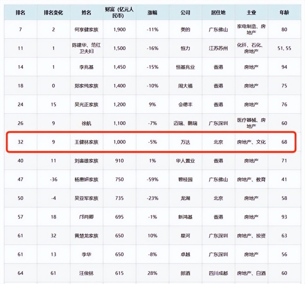 在债务危机之后一度变得极其低调的万达王健林家族,悄然夺回了地产首富的宝座,位列第32名。