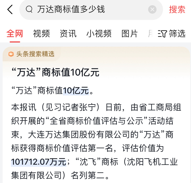 据报道,2005年,由辽宁省工商局组织开展的“全省商标价值评估与公示”活动结束,大连万达集团股份有限公司的“万达”商标获得商标价值评估第一名,评估价值为101712.07万元;“沈飞”商标(沈阳飞机工业集团有限公司)名列第二。