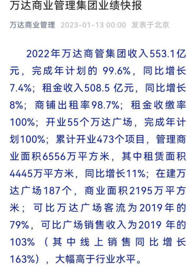 更早前,1月13日,万达商业管理集团发布2022年度业绩快报。