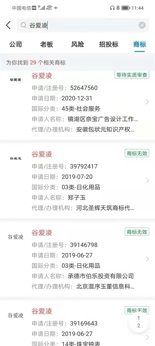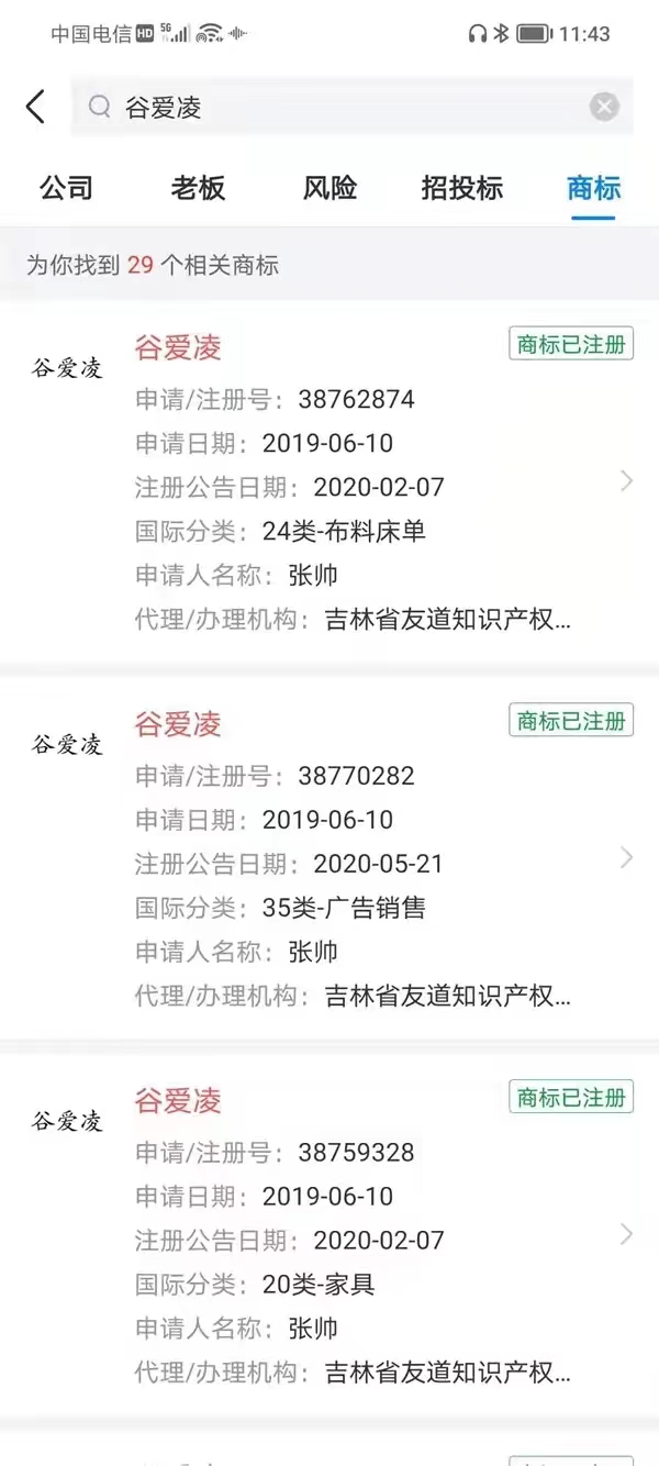 记者通过天眼查查询发现,“谷爱凌”商标申请信息有29条。其中,自然人张某于2019年6月申请的11个“谷爱凌”商标已完成注册,国际分类涉及教育娱乐、广告销售、布料床单等。其他公司及自然人申请的“谷爱凌”商标流程显示为“被驳回”或“商标无效”。
