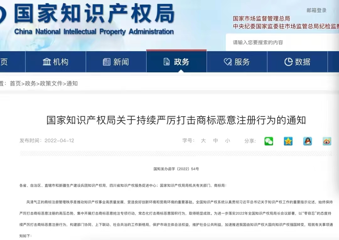 4月12日,国家知识产权局在官网发布《关于持续严厉打击商标恶意注册行为的通知》,要求以“零容忍”的态度持续严厉打击商标恶意注册行为,“更加聚焦人民群众关切和社会舆论关注”。