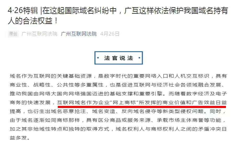 在广州互联网法院公众号有一篇文章,是这么说的“随着数字经济及电子商务的快速发展,互联网域名作为企业“网上商标”所发挥的商业价值和广告效益日益提高,域名逐渐如同商标那样,具有区分商品或服务来源、承载市场主体商誉等功能。