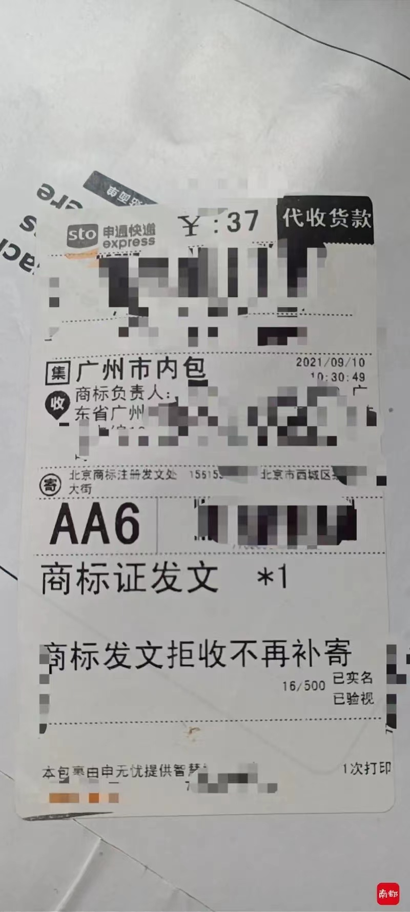 李先生提供给南都记者的快递面单显示,该件为“申通快递”包裹,该件寄件方是所谓的“北京商标注册发文处”,寄件地址为北京市西城区某大街。该面单还备注“商标证发文”“商标发文拒收不再补寄”。