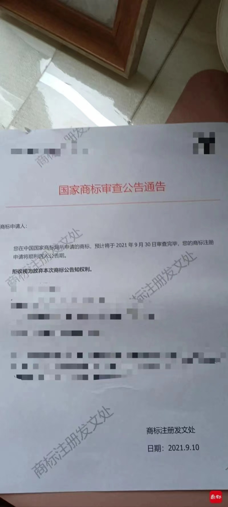 李先生拆开包裹发现,里头是一张写着“国家商标审查公告通告”字眼的A4纸。该“通告”称:“您在中国国家商标局所申请的商标,预计将于2021年9月30日审查完毕,您的商标注册申请将顺利进入公告期。拒收视为放弃本次商标公告知权利。”