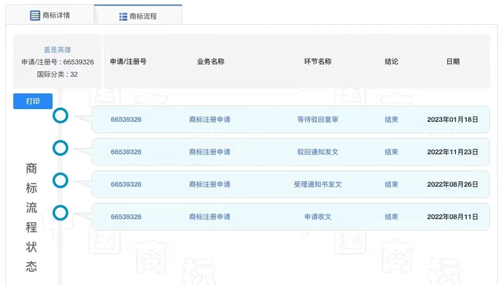 而2022年8月11日,该公司还曾申请过“盖是英雄”4个分类的商标,目前商标状态处于“等待实质审查”,而在国家知识产权局商标局的网站上显示,盖是英雄的相关商标,已经进入了“等待驳回复审”状态,最近的一个商标状态更新日期是在2023年1月18日。