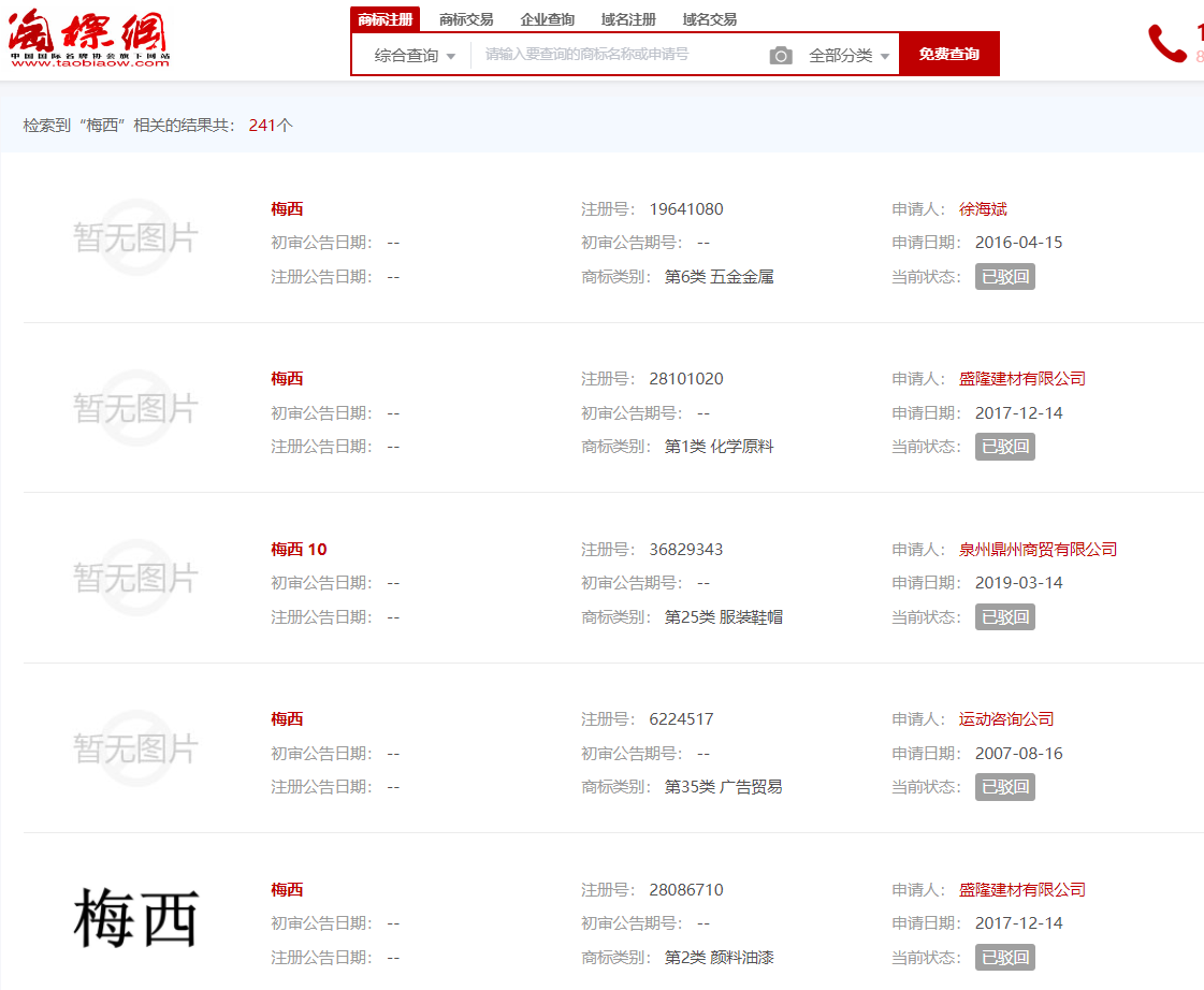 真正意义涉嫌抢注“梅西“商标的,则发生在2005年。2005年,国内一名叫徐尚德人率先申请了“梅西”的商标注册申请,国际分类为“服装鞋帽”,但该商标并没有获得通过。