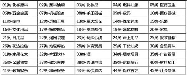不同的商品归属不同的类别,共计45个类别,1-34类为产品,例如皮具箱包为第18类,水果蔬菜第31类。35-45类为服务,例如餐饮住宿第43类,法律服务第45类等等。