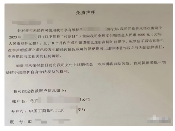 前几天普推商标老杨在同行群看到的,一个企业的申请商标由于使用商业字体被索赔3000元,并要求要在8个月内完成变更和注销,以此普推老杨曾多次写过关于字体版权的原创内容,有些字体可以商用,有些字体无法不购买授权商用就会有公司找,有些字体你不知道是否无法商用尽量不要用。