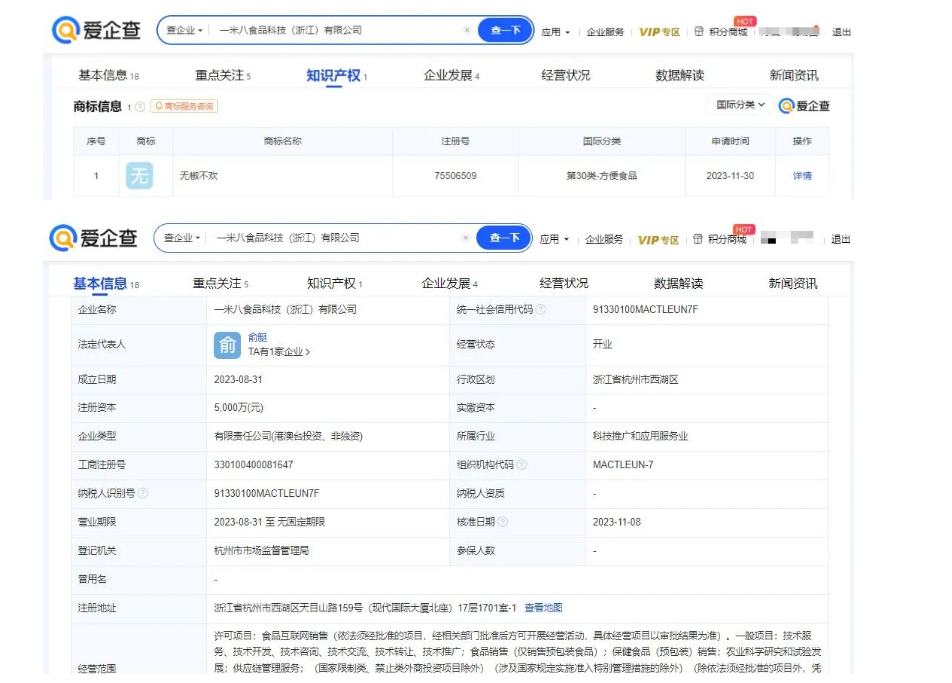爱企查APP显示,近日,一米八食品科技(浙江)有限公司申请注册1枚“无椒不欢”商标,国际分类为方便食品,当前商标状态为等待实质审查。该公司成立于2023年8月,法定代表人为俞艇,注册资本5000万元人民币,在该公司多位股东中,1.8 Meters Technology Holding Limited持股55%,杭州大井头贰拾贰号文化艺术有限公司持股10%,后者由马云持股99.9%。据媒体报道,近期,马云投资新农业品牌“一米八”亮相,由蚂蚁集团前CEO、前阿里合伙人胡晓明担任一米八农业科技公司董事长兼首席品控官。胡晓明介绍,“一米八”公司的名字,源自马云参与农业的一个初心,天底下所有的妈妈,都希望自己的孩子能够健康成长,身高超过一米八。爱企查信息显示,截至目前,与马云关联的企业名称中含“一米八”的公司已有多家,“一米八”系各个公司的法人、高管均是来自阿里系不同领域的高管。