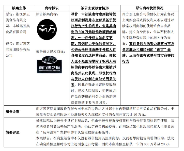 笔者在“知产宝”中搜索“反向混淆”经典案例,并对判决中对于被告(侵权人)主观故意情形及原告商标使用情况进行提炼,列表如下: