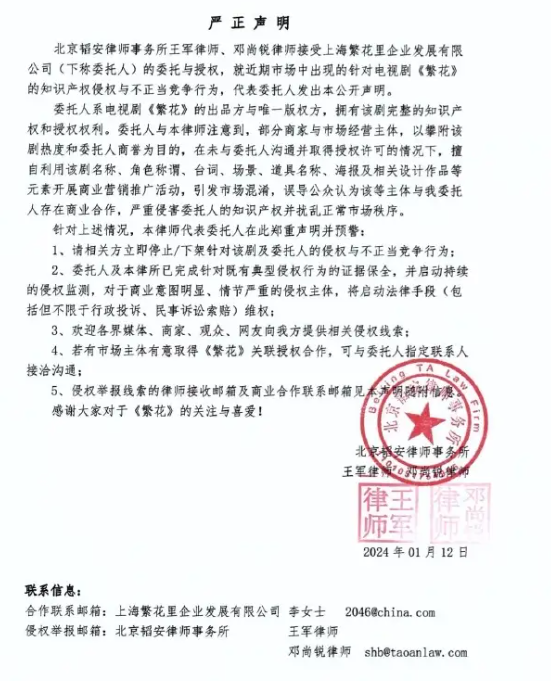 1月12日,《繁花》官方发出律师声明回应相关商标被注册一事,表示“部分商家与市场经营主体,以攀附该剧热度和委托人商誉为目的,在未经沟通并取得授权许可的情况下,擅自利用该剧名称、角色称谓、台词、场景、道具名称、海报及相关设计作品等元素开展商业营销推广活动,误导公众认为该等主体与我委托人存在商业合作,严重侵害委托人的知识产权并扰乱正常市场秩序。请相关方立即停止/下架针对该剧及委托人的侵权与不正当竞争行为。对于商业意图明显、情节严重的侵权主体,将启动法律手段(包括但不限于行政投诉、民事诉讼索赔)维权”,最后《繁花》官方还表示欢迎各界媒体、商家、观众、网友提供相关侵权线索。