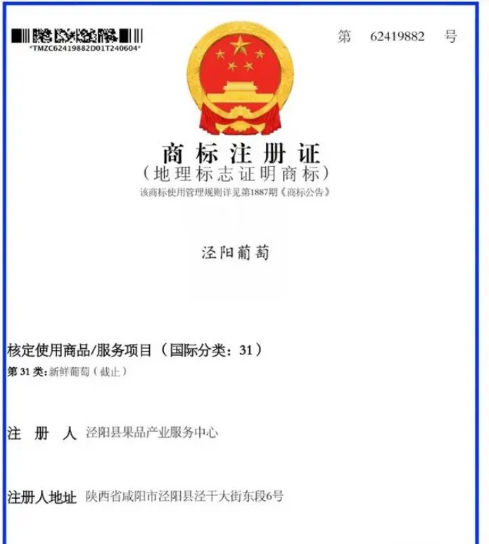 三秦都市报-三秦网讯(乔义平 祁彦锋)近日,国家知识产权局发布证明商标注册公告,咸阳市 “泾阳葡萄”核准注册为国家地理标志证明商标,这是地理标志管理职能整合以来该市首件核准注册的地理标志。