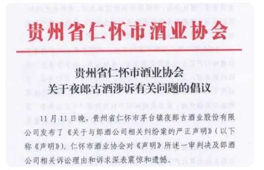 11月13日,贵州省仁怀市酒业协会发出《关于夜郎古酒涉诉有关问题的倡议》,倡议涉诉双方认同并珍视赤水河谷人文传统,摒除成见,以理性务实的态度沟通交流,妥善处理知识产权及所谓“不正当竞争”等方面的分歧。