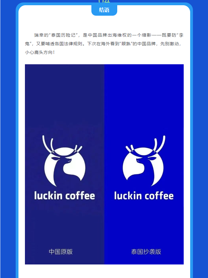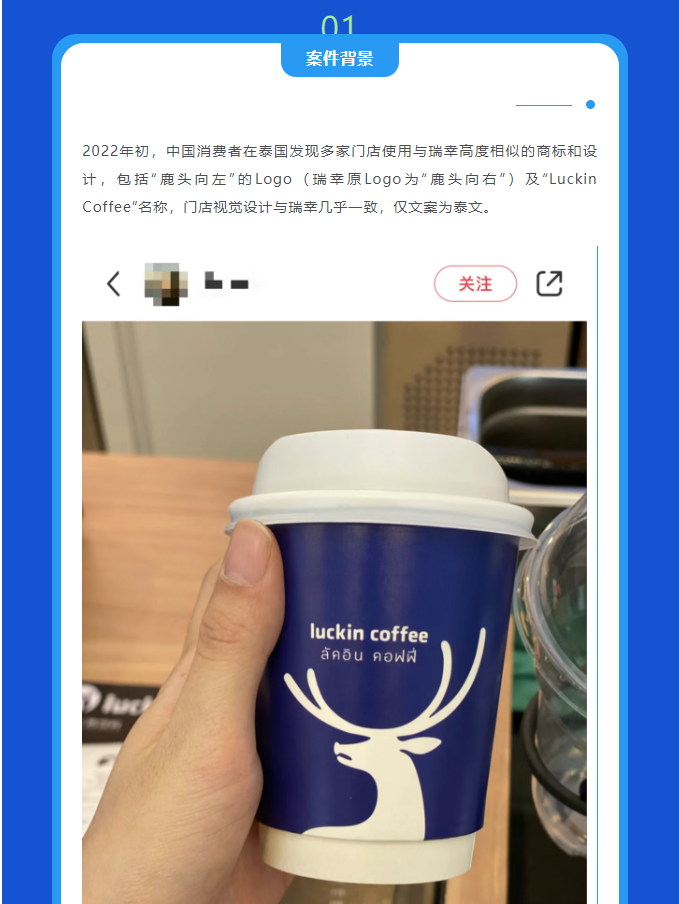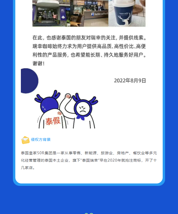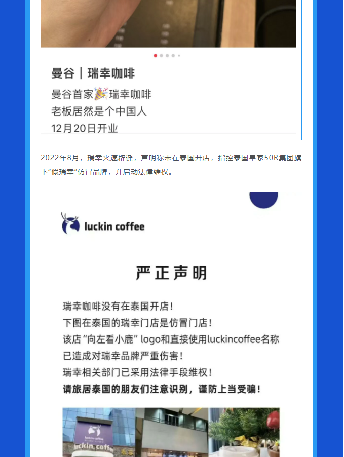 2022年初,中国消费者在泰国发现多家门店使用与瑞幸高度相似的商标和设计,包括“鹿头向左”的Logo(瑞幸原Logo为“鹿头向右”)及“Luckin Coffee”名称,门店视觉设计与瑞幸几乎一致,仅文案为泰文。