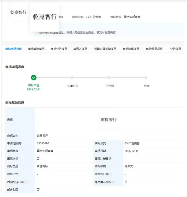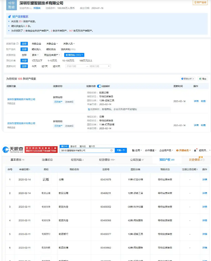 每经快讯,淘标网线索信息显示,近日,深圳引望智能技术有限公司申请注册“乾崑智行”“乾崑智能”“乾崑云雁”“乾崑纵横”“乾崑先锋”“乾崑寻迹”商标,国际分类涉及运输工具、广告销售、网站服务等,当前商标状态均为等待实质审查。该公司成立于2024年1月,法定代表人为郑丽英,注册资本10亿元人民币,经营范围包括智能车载设备制造、智能车载设备销售、汽车零部件研发、汽车零部件及配件制造、人工智能理论与算法软件开发等,由华为技术有限公司全资持股。