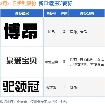 伊利股份新提交“泉爱宝贝”、“驼领冠”等8件商标注册申请