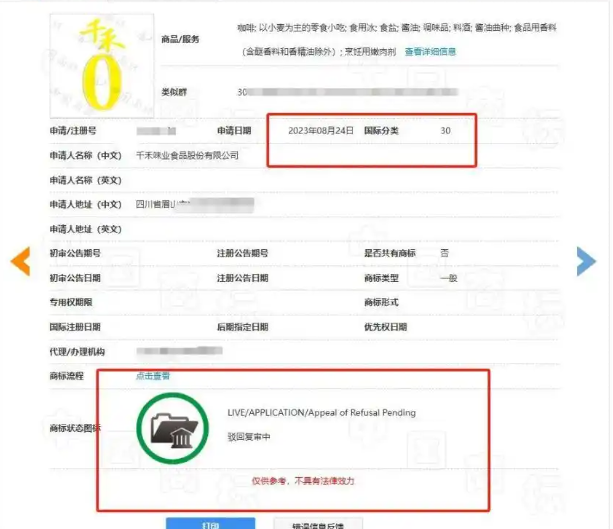 华商报大风新闻记者调查发现,“千禾0”为千禾味业食品股份有限公司于2023年8月申请,目前状态为“驳回复审中”,未正式通过申请。
