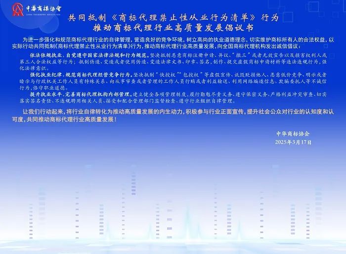 近日,中华商标协会发布了共同抵制《商标代理禁止性从业行为清单》行为,推动商标代理行业高质量发展。全文如下: