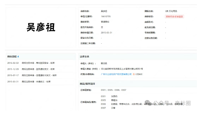 据查询,“吴彦祖”曾被申请注册为商标,申请人为韩某,国际分类为日化用品。虽然目前该商标已被驳回,处于无效状态,但这一事件足以敲响警钟,吴彦祖商标早已被人盯上,随时面临被抢注的风险。一旦商标被恶意抢注,不仅会损害吴彦祖的品牌形象,还可能导致其在商业活动中面临诸多法律纠纷和经济损失。