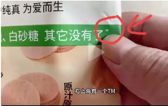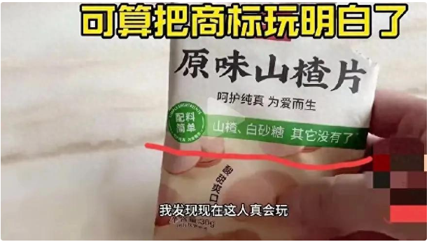 一位商家把配料简单写在包装封面,原味山楂,配料就写着,白砂糖,山楂,其他没有了,但仔细看文字的伙伴可以看见,这其他没有了的右上角标注了TM。