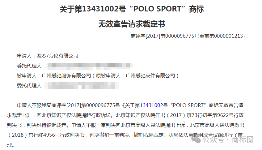 2018年9月,拉夫劳伦在一审中败诉。北京知识产权法院维持了广州爱驰皮件有限公司关于“Polo Sport”及图形商标等系列商标的注册,使拉夫劳伦陷入了极度被动的局面。