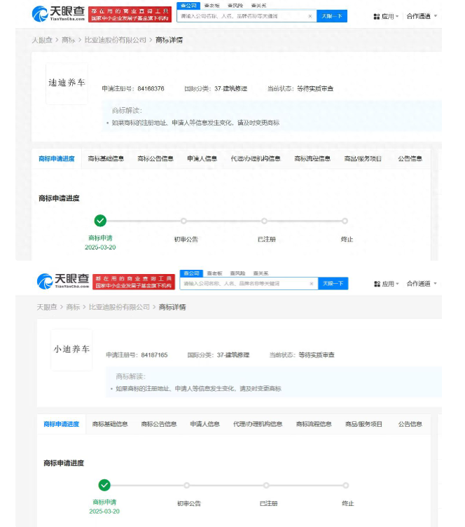 近日,比亚迪(002594.SZ)申请注册"迪迪养车""小迪养车"商标一事引发市场关注。天眼查信息显示,上述商标国际分类为建筑修理类,目前处于等待实质审查阶段。