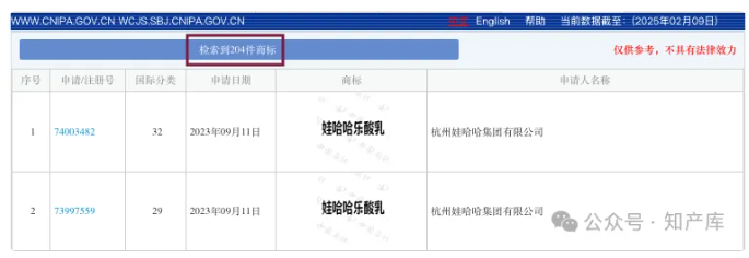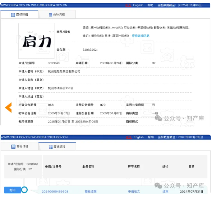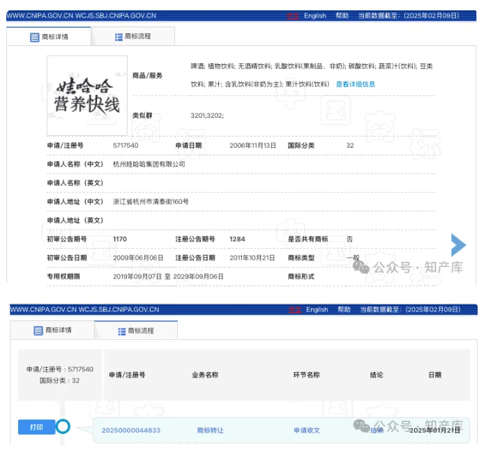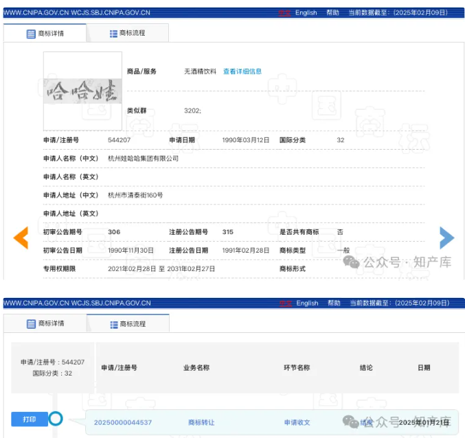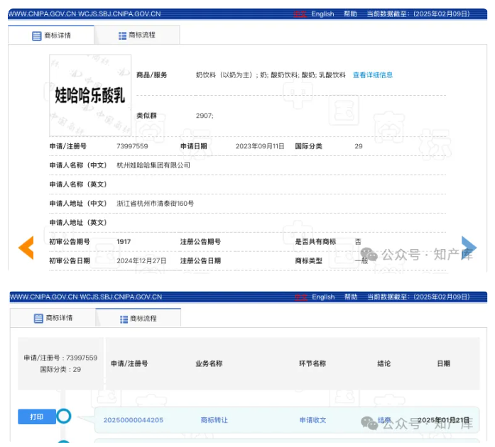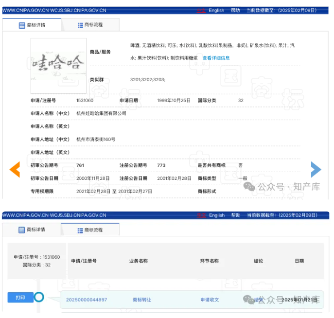 最新申请含有“娃哈哈”的商标还是2023年9月,2024年12月才进入初审公告,目前尚未核准注册,显示1月21日商标转让申请收文~