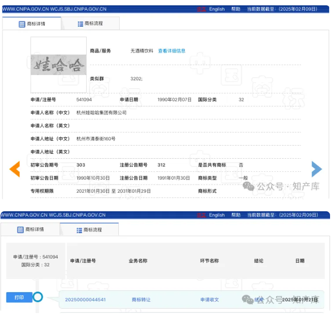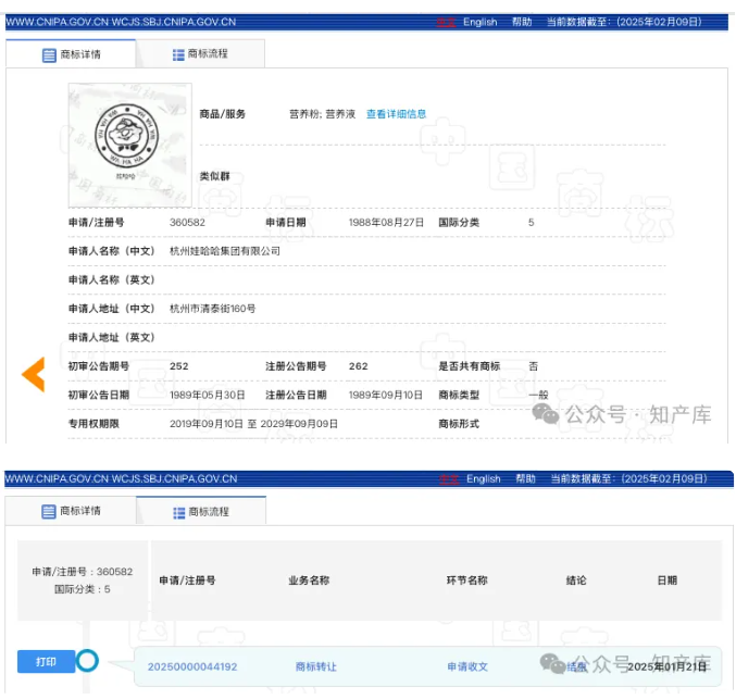 一、近日,有多个媒体爆出杭州娃哈哈集团转让“娃哈哈”商标,并展示了一件第10类医疗器械领域“娃哈哈”商标的流程信息,显示2025年1月21日,“商标转让”申请收文,这容易让人误会,只转让这一个商标?📃