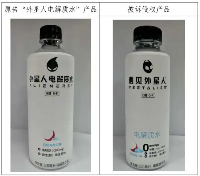 然而,市场热度催生了仿冒乱象。2023年起,广州唯某公司(法定代表人王某甲)、江苏唯某公司(法定代表人王某乙,王某甲之妻)联合委托金某公司生产“遇见外星人电解质水”,并通过微信朋友圈、行业展会等渠道对外销售。