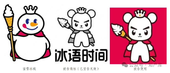 冰语公司使用的“”标识与蜜雪冰城第33299216号等5项“雪王”系列商标在元素构成(如冰淇淋权杖、王冠、披风)、表现形式及视觉效果上高度相似,容易导致消费者混淆误认。 - 恶意注册与使用