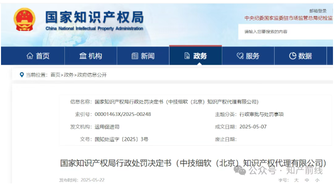 当事人上述行为属于《市场监督管理严重违法失信名单管理办法》第九条第(二)项“从事严重违法专利、商标代理行为”,根据《市场监督管理严重违法失信名单管理办法》第二条、第十二条相关规定,决定将中技细软(北京)知识产权代理有限公司列入市场监督管理严重违法失信名单,通过国家企业信用信息公示系统公示,并实施相应管理措施。列入期限自2025年5月7日起至2028年5月6日。期满一年后,当事人可依据《市场监督管理严重违法失信名单管理办法》第十六条、第十七条规定向我局申请提前移出严重违法失信名单,停止公示相关信息并解除相应管理措施。