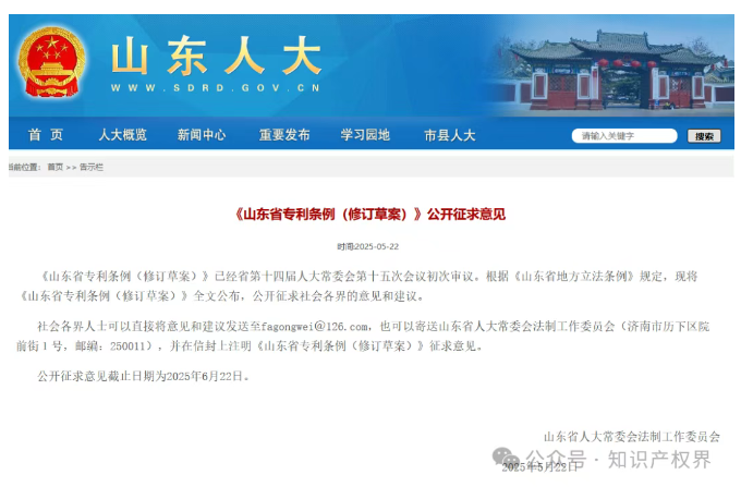 目前,《山东省专利条例(修订草案)》公开征求社会各界的意见和建议。社会各界人士可以直接将意见和建议发送至fagongwei@126.com,也可以寄送山东省人大常委会法制工作委员会(济南市历下区院前街1号,邮编:250011),并在信封上注明《山东省专利条例(修订草案)》征求意见。公开征求意见截止日期为2025年6月22日。
