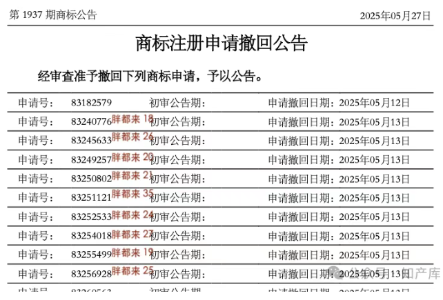 一、5月27日,最新的第1937期商标公告,刊登了系列商标注册申请撤回公告。
