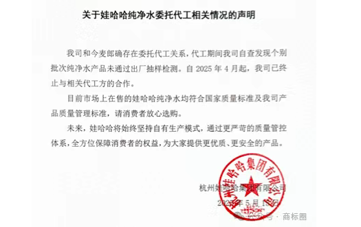 面对网友们的质疑,娃哈哈官方发布声明,承认和今麦郎确实存在委托代工关系,不过从2025年4月起,就终止了和今麦郎的合作。